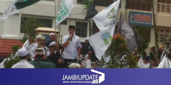 iklan Gubernur Jambi, Zumi Zola saat memberikan orasi didepan ribuan masyarakat yang hadir dalam aksi damai didepan Novita Hotel Jambi.