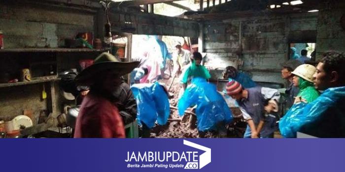 Saat ini, warga setempat sedang membersihkan tanah yang masuk ke rumah korban akibat diterjang longsor.(adi)