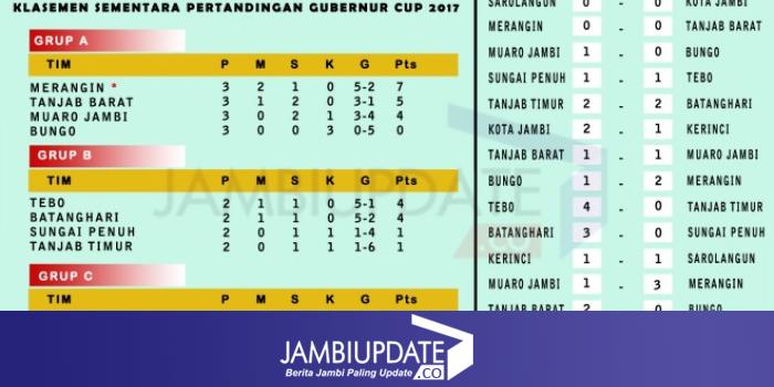 JAMBIUPDATE.CO, JAMBI Pertandingan di Grup A Gubernur Cup 2017, sudah berakhir sore tadi (13/1). Dalam laga yang digelar di Stadion Tri Lomba Juang, Koni Jambi, ini PS Merangin dan PS Tanjab Barat berhasil mengalahkan lawannya.