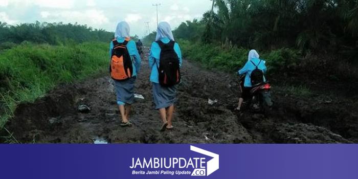 JAMBIUPDATE.CO, MUARASABAK - Kondisi akses jalan yang sangat memperihatinkan di Kecamatan Sadu, Kabupaten Tanjab Timur, membuat anak-anak kesulitan pergi ke sekolah. Pasalnya, saat musim hujan kondisi jalan ini sangat sulit dilalui, bahkan kerap membuat siswa mengurungkan niatnya karena baju yang dipakai kotor karena jatuh.