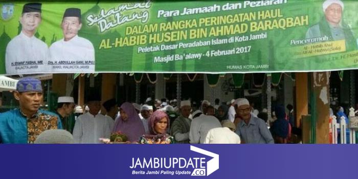 JAMBIUPDATE.CO, JAMBI - Pemerintah Kota Jambi kembali menggelar Peringatan Haul Ad-Dai IlAllah Al-Habib Husein bin Ahmad Baraqbah peletak dasar peradaban Islam di Jambi pada abad ke 18. Puncak peringatan Haul Al-Habib Husein yang juga dikenal dengan sebutan Keramat Tambak di sebagian kalangan masyarakat setempat itu, berlangsung di Masjid Baalawy Kelurahan Arab Melayu, Kecamatan Pelayangan, Kota Jambi Sabtu (4/1).