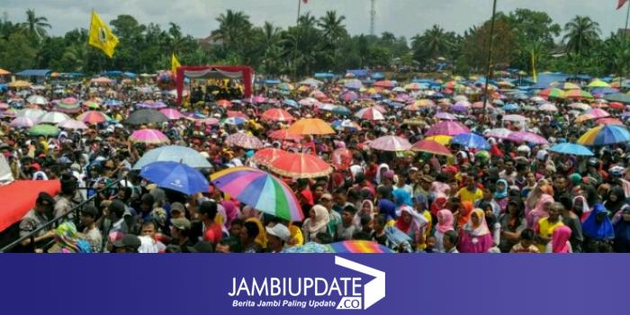 JAMBIUPDATE.CO, MUARATEBO - Ratusan ribu massa mulai memadati lokasi kampanye Akbar Pasangan Nomor Urut 2 Suka-Syahlan di Lapangan Rimbo Bujang.