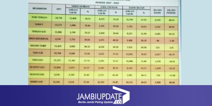 Suara masuk dari 657 TPS atau menyisakan 12 TPS lagi sebanyak 162.416 atau 73,74 persen. Pasangan Suka Syahlan menang di 4 Kecamatan yaitu Rimbo Bujang, Rimbo Ulu, Rimbo Ilir dan Muaro Tabir. Sedangkan Pasangan Hamdi Harmain unggul di 8 Kecamatan yaitu Tebo tengah, Tebo Ulu, Tebo Ilir, Tengah Ilir, VII Koto, VII Ilir, Sumay, dan Serai Serumpun.(bjg)