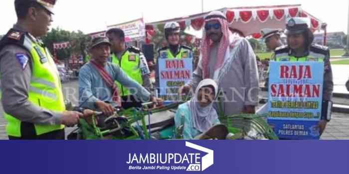 Di Demak, Jawa Tengah, kepolisian setempat sampai mengerahkan Raja Salman untuk ikut Operasi Simpatik yang digelar Jumat (3/3). Sosok Raja Salman diperankan oleh Kabagops Polres Demak Kompol Sutomo.