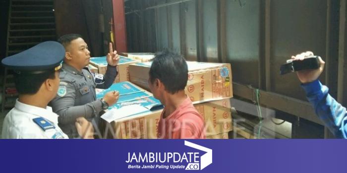iklan Petugas Dishub dan Kepolisian saat memeriksa izin truk Fuso yang kedapatan masuk Kota Jambi dengan muatan melebihi tonase.