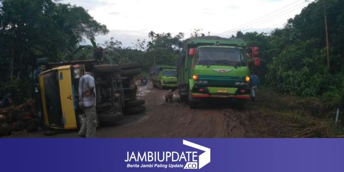 Truck yang diketahui mengangkut tandan buah segar tersebut, terbalik akibat kondisi jalan yang kian memprihatinkan.