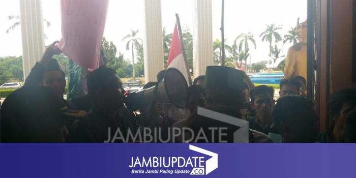 Massa dari HMI berunjuk rasa didepan pintu utama Kantor DPRD Provinsi Jambi.