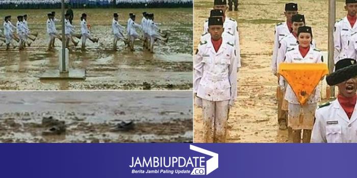Foto-foto tersebut memperlihatkan pasukan pengibar bendera pusaka (Paskibraka) berjuang keras melewati lumpur di lapangan upacara.
