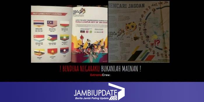Tampilan laman tersebut berwarna hitam. Di bagian atas memperlihatkan buku panduan Sea Games 2017 dengan bendera Indonesia yang terbalik. Kemudian bagian bawahnya terpampang tulisan "! BENDERA NEGARAKU BUKANLAH MAINAN !" dengan warna merah putih.