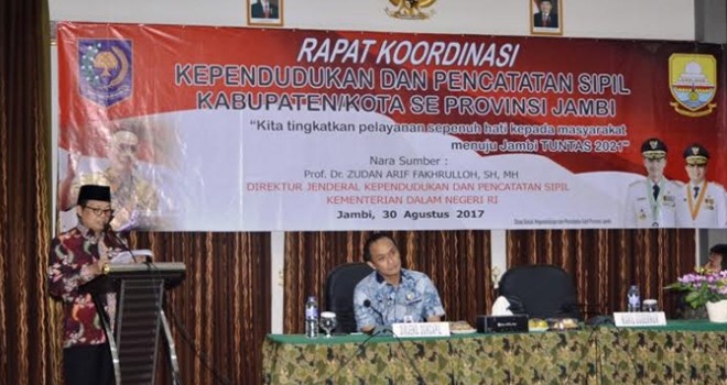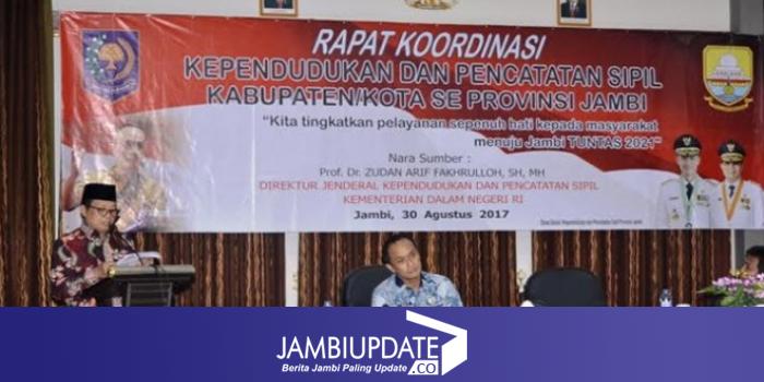 Direktur Jenderal Kependudukan dan Pencatatan Sipil Kementerian Dalam Negeri RI, Prof.Dr.Zudan Arif Fakhrulloh,SH,MH narasumber dalam Rakor Kependudukan dan Pencatatan Sipil Kabupaten/Kota Se Provinsi Jambi Tahun 2017 tersebut.