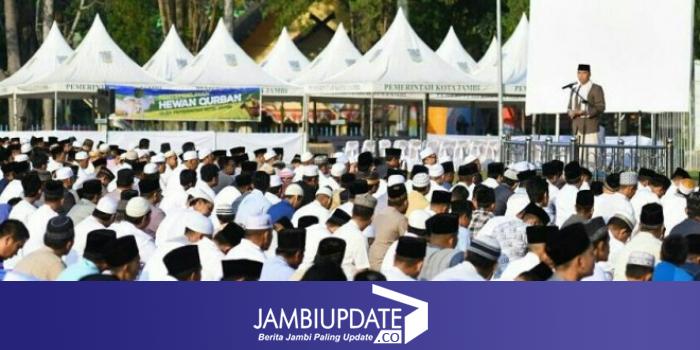 JAMBIUPDATE.CO, JAMBI - Gema takbir, tasbih dan tahmid berkumandang dilangit Tanah Pilih Pusako Batuah Kota Jambi. Jumat pagi (1/9) bersamaan dengan 10 Dzulhijjah 1438 hijriyah, ummat muslim dari berbagai pelosok Kota Jambi menunaikan ibadah shalat Idul Adha bersama Wali Kota Jambi DR. H. Syarif Fasha beserta jajaran di lapangan utama kantor Wali Kota.