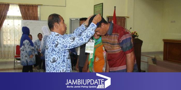 Pemasangan tanda peserta diklat oleh Kepala Tata Usaha BPP Jambi, Marsudi kepada perwakilan peserta.