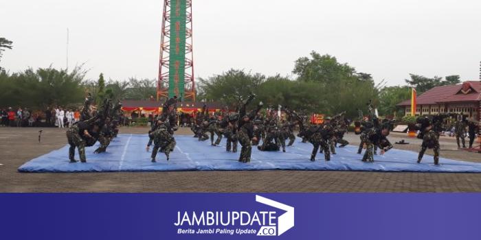 Puluhan orang terlibat saling pukul. Aksi ini ternyata bukan sungguhan. Mereka menampilkan bela diri praktis Satbrimob Polda Jambi dengan menggabungkan lima teknik bela diri.