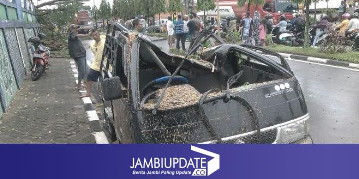 Sebuah kendaraan ringsek berat akibat tertimpa pohon di depan TPU Singkawang, Kota Jambi (17/11)
