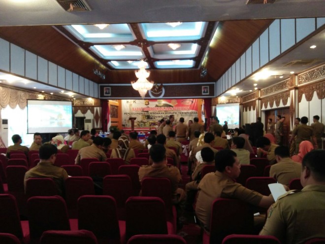 Bertempat di aula rumah dinas gubernur Jambi, Senin (20/11) siang, pihak KPK menggelar rapat Koordinasi dan Supervisi Pencegahan dan Penindakan Korupsi Terintegrasi betsama Pemerintah Provinsi Jambi.