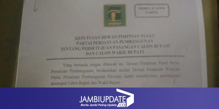 JAMBI- Partai Persatuan Pembangunan (PPP) akhirnya menguak kepastian duet Al Haris-Mashuri. Buktinya PPP resmi mengeluarkan SK dukungan yang diserahkan langsung Ketua Umum DPP PPP Romahurmuziy di Hotel Abadi Grand, Kamis (7/12).