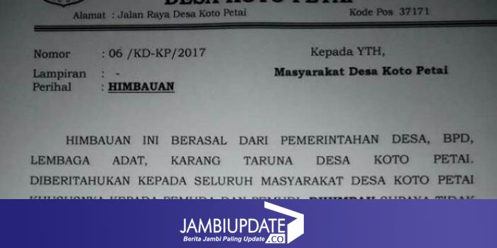Darul, warga Desa Koto Petai, dikonfirmasi membenarkan adanya himbauan tersebut. "Benar, himbauan itu berasal dari Pemerintah Desa, BPD, Lembaga Adat, Karang Taruna Desa Koto Petai, yang ditanda tangani langsung oleh Kades Koto Petai," ujar Darul.