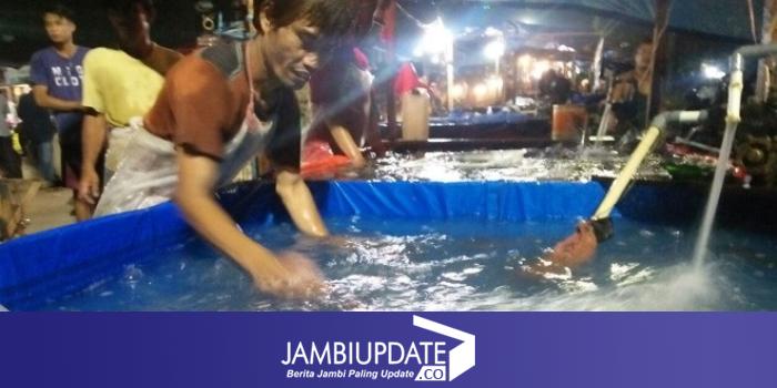 Agen Ikan di Pasar Induk Paal X Kota Jambi Tengah Sibuk melayani pembeli rabu malam (3/1).