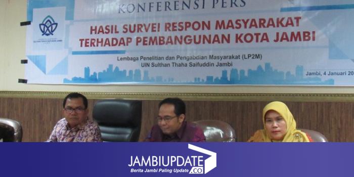 JAMBIUPDATE.CO, JAMBI - Lembaga Penelitian dan Pengabdian Masyarakat UIN STS Jambi memaparkan berbagai hasil survey yang telah dilakukan terhadap pembangunan di Kota Jambi pada konferensi pers, Kamis (4/1).