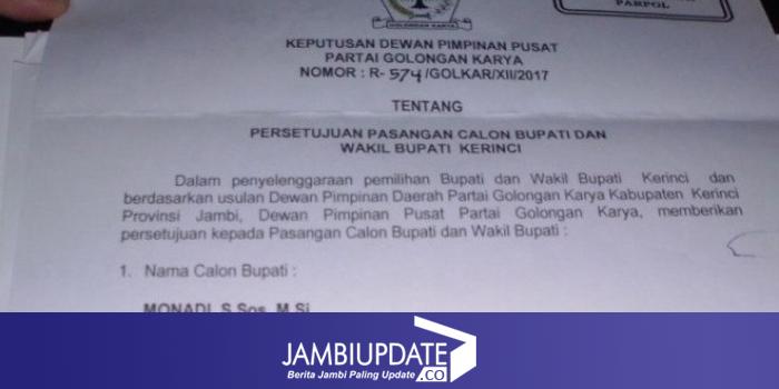 JAMBIUPDATE.CO, JAMBI Partai Golongan Karya (Golkar) akhirnya resmi melabuhkan dukungan kepada pasangan Monadi-Edison di Pilkada Kerinci 2018.