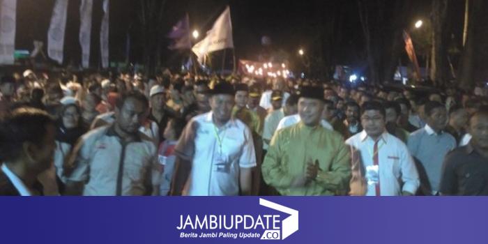 JAMBIUPDATE.CO, JAMBI- Ribuan massa mengiringi pendaftran Bakal pasangan calon Walikota dan Wakil Walikota, Fasha-Maulana ke KPU Kota Jambi, Rabu malam (10/1).