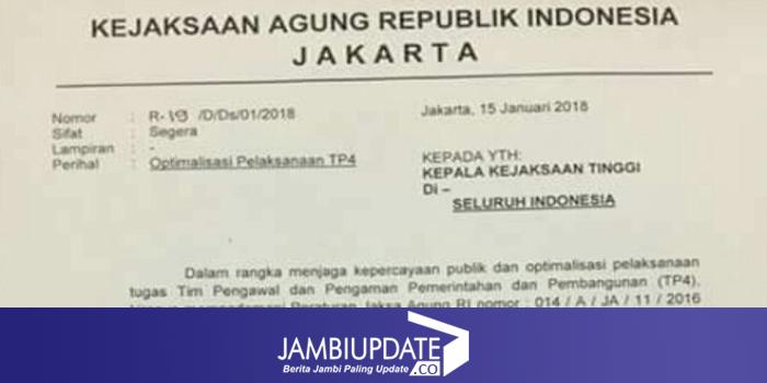 JAMBIUPDATE.CO, JAMBI-Beredarnya surat Kejagung RI dengan tanda tangan Jamintel Jan S Maringka bernomor R-19,/D/Dis/01/2018 tentang optimalisasi pelaksanaan TP4D dipertanyakan kebenarannya di tengah masyarakat.