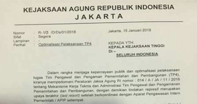 Surat yang menekankan mekanisme kerja teknis dan administrasi Tim Pengawalan dan Pengamananan Pemerintahan dan Pembangunan (TP4D).