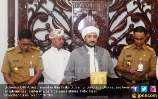 JAMBIUPDATE.CO, JAKARTA - Gubernur DKI Jakarta Anies Baswedan dan wakilnya, Sandiaga Uno, tertangkap kamera sedang memainkan handphone saat konferensi pers bersama ulama asal Mekah Syekh Muhammad bin Ismail Zen Al Makki di Balai Kota, Senin (22/1).