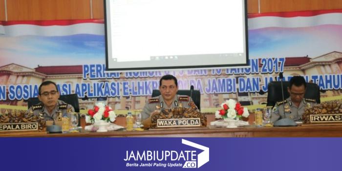JAMBIUPDATE.CO, JAMBI - Wakapolda Jambi, Kombes Pol Ahmad Haydar, pagi tadi (25/1) membuka kegiatan Sosialisasi Perkap Nomor 08 Tahun 2017 Tentang Penyampaian E-LHKPN di Lingkungan personil Kepolisian Negara Republik Indonesia di Polda Jambi Beserta Polres Jajaran oleh Tim Itwasum Polri. Kegiatan berlangsung di aula Tribrata lantai 4 gedung Mapolda Jambi.