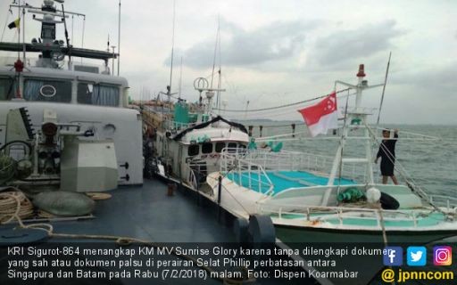 JAMBIUPDATE.CO, JAKARTA - KRI Sigurot-864 salah satu unsur Koarmabar yang sedang melaksanakan Operasi Pengamanan Perbatasan (Pamtas) RI Singapura 2018 BKO Gugus Keamanan Laut (Guskamla) berhasil menangkap MV Sunrise Glory tanpa dilengkapi dokumen yang sah atau dokumen palsu. Penangkapan kapal tersebut berlangsung di perairan Selat Phillip perbatasan antara Singapura dan Batam pada Rabu (7/2/2018) malam.