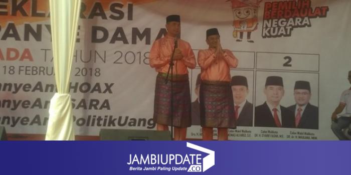 JAMBIUPDATE.CO, JAMBI-Pasangan nomor urut 2 Syarif Fasha dan Maulana turut hadir di kampanye dan deklarasi damai Pilwako Jambi 2018. Deklarasi digelar di Tugu Keris Siginjai, Kotabaru, Minggu (18/2) pagi.