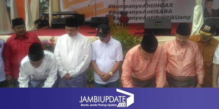 Bertempat di tugu Keris Siginjai, Kota Baru, Minggu (18/2), pembacaan naskah deklarasi damai itu dipandu oleh Ketua KPU kota Jambi, Wein Arifin.