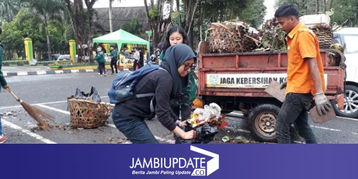 Petugas Kebersihan dan masyarakat komunitas peduli sampah membersihkan sampah di tengah Kota Jambi pada peringatan Hari Peduli Sampah Nasional.