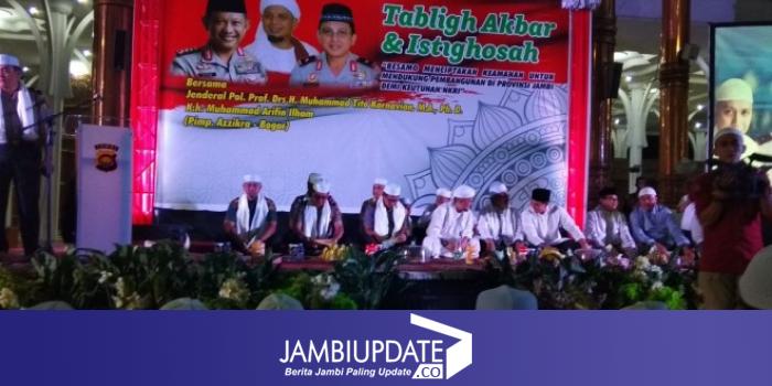Kedatagan kapolri dan rombongan disambut oleh Gubernur Jambi Zumi Zola, beserta unsur Forkopimda. Ribuan jemaah juga sudah berkumpul untuk mengikuti Tablig Akbar ini. (pds)