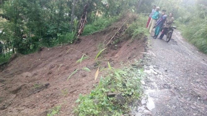 Pantauan di lapangan, sebagian material longsor menutupi badan jalan, selain itu juga ada badan jalan yang terbawa longsor. Badan jalan yang longsor tepat berada di ladang milik warga, kondisi ladang warga sendiri seluruh tanaman tertimbun material tanah dan batu.