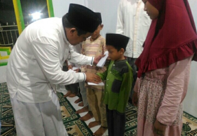JAMBIUPDATE.CO, JAMBI- Anggota DPRD Provinsi Jambi, Zainal Abidin memberikan santunan kepada anak-anak jamaah Masjid Nurul Huda. Ini dilakukannya usai menggelar sholat Isya dan tarawih bersama warga Talang Bakung, Kamis malam (17/5).