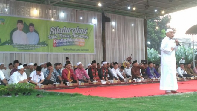 JAMBIUPDATE.CO, JAMBI - Pasangan Calon Walikota dan Wakil Walikota Jambi menggelar acara silahturahmi dan buka puasa bersama dengan ribuan relawan pemenangan, Jumat (8/6) di ev Garden, Paal Merah, Jambi Selatan.