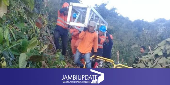 JAMBIUPDATE.CO, KERINCI-Petugas PLNdari beberapawilayah melakukan perbaikan terhadap tower PLN yang ambruk di Desa Birun, Kecamatan Pangkalan Jambu, Merangin.