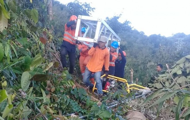 Petugas dari PLN bahu-membahu melakukan perbaikan tower di Desa Birun yang ambruk. Tower ambruk diduga akibat adanya komponen tower yang dicuri