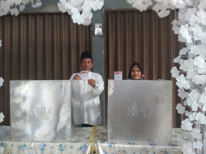 "Tidak sengaja kami dapat giliran pertama sekeluarga," sebutnya. Hal ink dikarenakan dari pukul 07.00 WIB pagi Sani sudah berada di TPS ini.