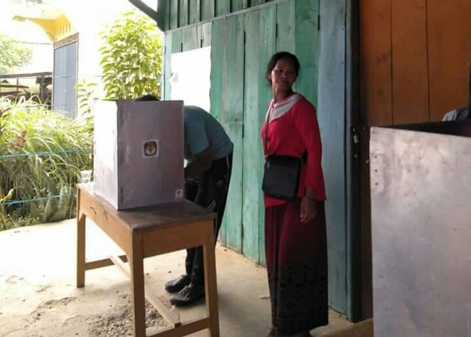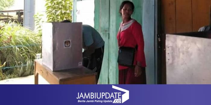 Pantawan dilapangan beberapa warga SAD tampak datang ke Tempat Pemungutan Suara (TPS) 04 di Desa Mentawak Kecamatan Bangko dengan membawa syarat untuk memilih.
