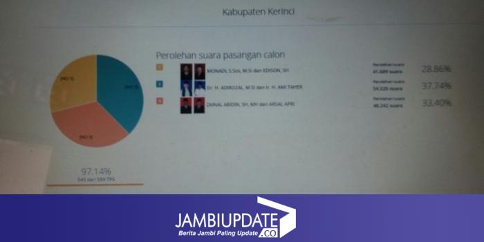 Masih berdasarkan pantauan jambiupdate.co di website tersebut, dari keseluruhan jumlah TPS di Pilkada Kerinci sebanyak 559 TPS, data yang sudah masuk sebanyak 543 TPS, hanya tingga 16 TPS lagi yang belum masuk.