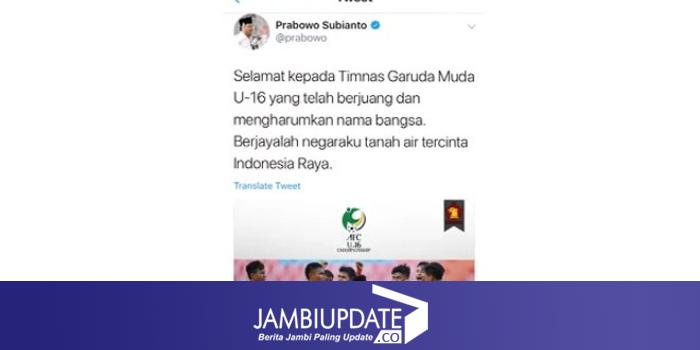 JAMBIUPDATE.CO. Gelar juara yang diperoleh tim nasional sepakbola Indonesia U 16 disambut gembira elemen bangsa, termasuk bakal calon presiden Prabowo Subianto."Selamat kepada Timnas Garuda Muda U-16 yang telah berjuang dan mengharumkan nama bangsa. Berjayalah negaraku tanah air tercinta Indonesia Raya," kata Prabowo lewat Twitternya, @prabowo, Minggu (12/8).