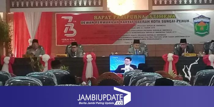 JAMBIUPDATE.CO, SUNGAIPENUH - Walikota H.Asafri Jaya Bakri (AJB) bersama Wakil Walikota H. Zulhelmi menghadiri rapat Paripurna Istimewa DPRD Kota Sungaipenuh, Kamis (16/8)