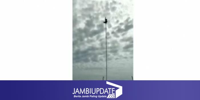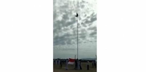 Dia memanjat tiang dengan tinggi belasan meter itu untuk mengambil bagian tali yang terlepas saat bendera dibentangkan.