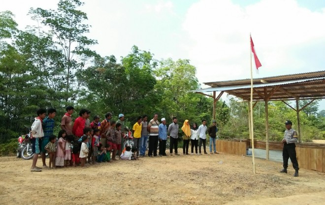 Mereka menggelar upacara dengan sederhana, tanpa baju yang gagah seperti para Paskibraka, bahkan tiang bendera Sang Saka Merah Putih pun hanya dari Kayu yang sederhana.