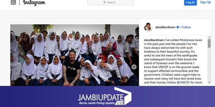 JAMBIUPDATE.CO, - Aku telah dua kali mengunjungi Indonesia setahun belakangan dan orang-orang yang kutemui selalu menerimaku dengan sangat baik hati di negara mereka yang indah. Sedih sekali melihat berita gempa bumi dan tsunami melanda Pulau Sulawesi akhir minggu kemarin, tulis David Beckham memperlihatkan fotonya bersama sejumlah pelajar di Tanah Air. Ia juga memperlihatkan sebuah foto yang memperlihatkan kerusakan yang terjadi dalam gempa Palu.