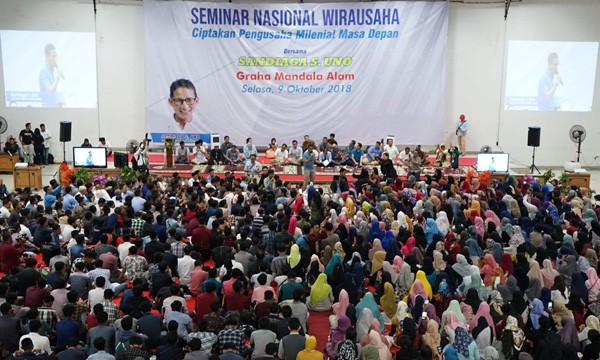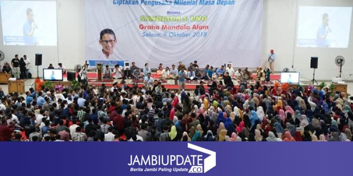 JAMBIUPDATE.CO, Bandar Lampung Calon Wakil Presiden nomor urut 02 Sandiaga Salahudin Uno disambut ribuan milenial saat hadir dalam acara Seminar Nasional Wirausaha, Ciptakan Pengusaha Milenial Masa Depan, di Graha Mandala Alam, Selasa, (9/10/2018). Sandi memberikan resep suksesnya sebagai pengusaha.