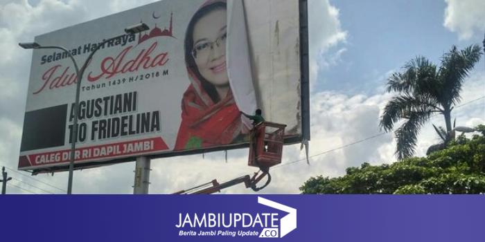 iklan PEMILU : Bawaslu Kota Jambi dan stakeholder menurunkan baliho salah satu Caleg di kawasan jalan kapten Fattimura, Rabu (10/10) kemarin.