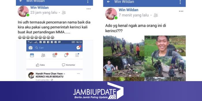 Alwin Kincai, ketika dikonfirmasi mengatakan bahwa dirinya sangat tidak terima atas perilaku akun FB Handri Pewe Chan Yeon, yang memposting wajah dirinya di gruop Kerinci Hilir Bersatu. "Itu sudah termasuk pencemaran nama baik, baik yang kenal dengan Handri Pewe Chan Yeon suruh hubungi saya. Saya juga berencana, akan melaporkan ke Polisi," singkat Alwin.(adi)